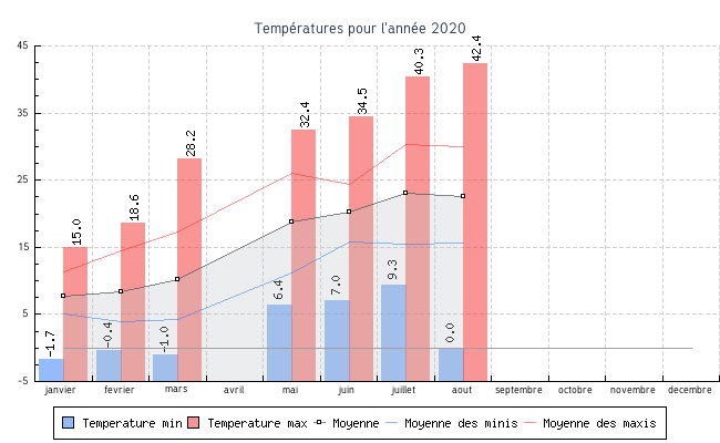 | juillet | 9.3 °C | 15.5 °C | 40.3 °C | 30.3 °C | 23.1 °C | 3.8 km/h | 24.0 km/h | NO |